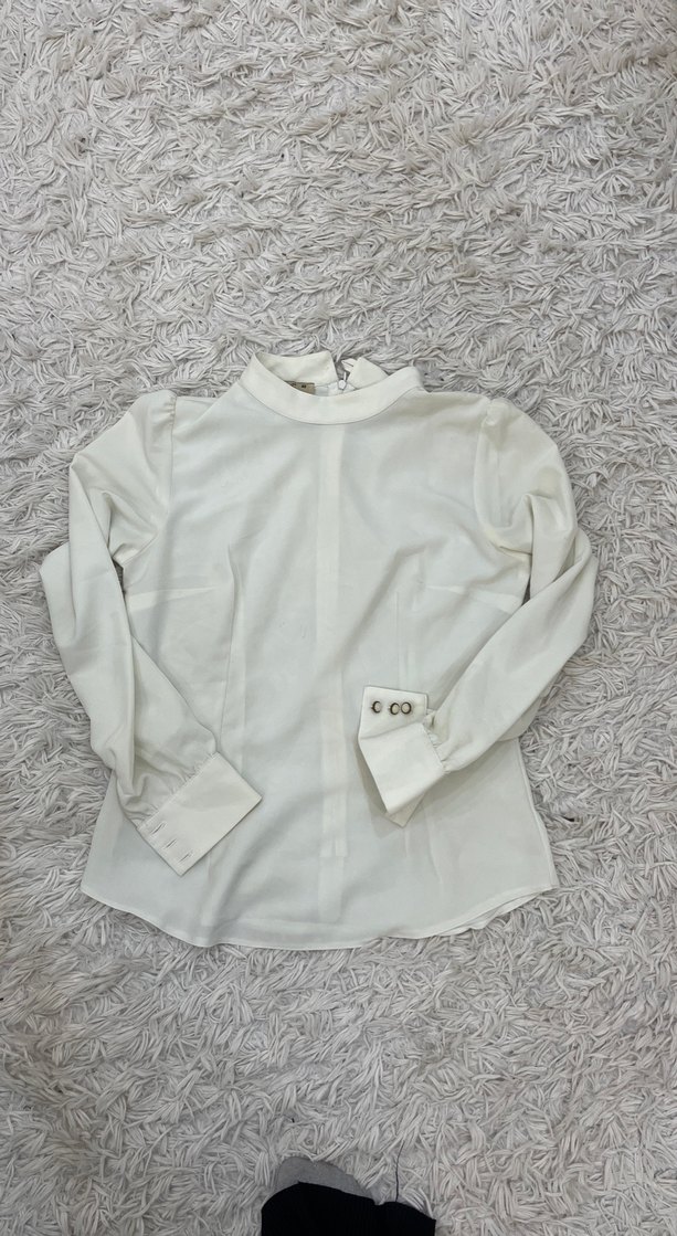 Düğmeli manşetlere ve yüksek yakaya sahip beyaz uzun kollu gömlek. Yumuşak ve sıcak kumaştan, normal kesim, sade ve iş ortamına uygun stil.