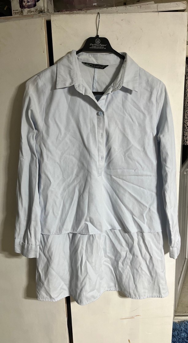 Beyaz keten kumaştan, uzun kollu, yakalı ve düğmeli kadın gömleği. Rahat kesimi ve midi boy uzunluğu ile günlük sokak stiline uygundur.