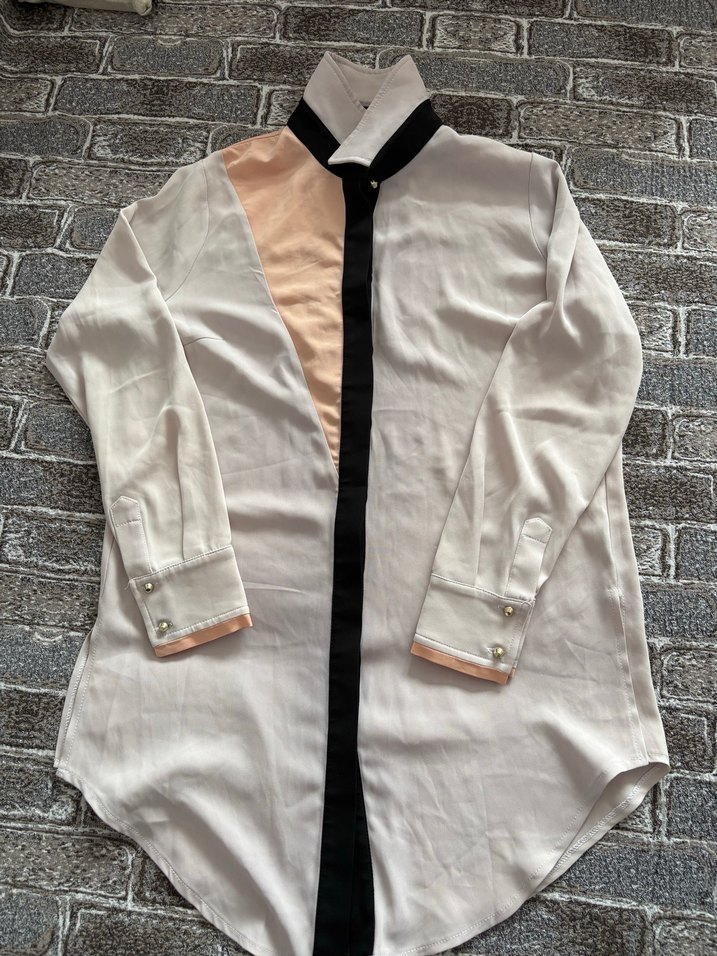 Düğmeli manşetli uzun kollu, yakalı midi kadın gömleği. Beyaz ve bej tonları, siyah düğme şeridiyle birleşiyor. Pürüzsüz sentetik kumaştan, günlük kullanım için uygun.
