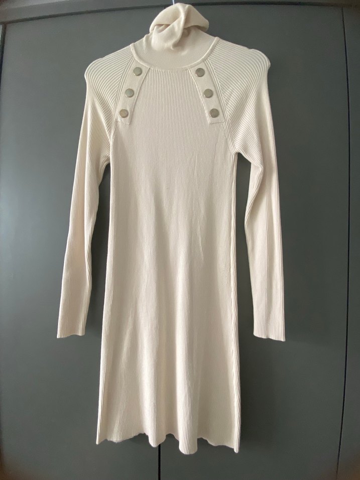 Düğmeli, yüksek yakalı ve uzun kollu beyaz triko elbise. Uzun boyu ve düz yapısıyla günlük şıklık sunan sentetik kumaştan yapılmıştır.