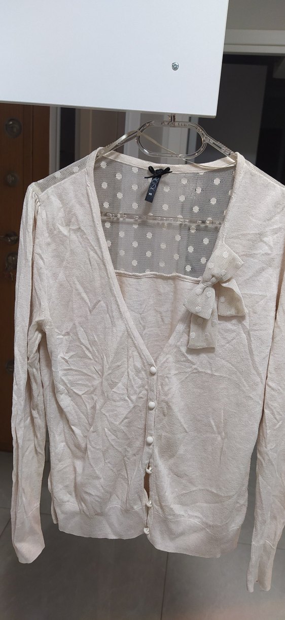 Bu beyaz hırka, V yaka ve düğmeli kapanışa sahiptir. Pamuklu yumuşak kumaştan, uzun kollu ve bol kesim midi boydur. Bohem tarzda, küçük puantiyeli fiyonk detayı bulunur.