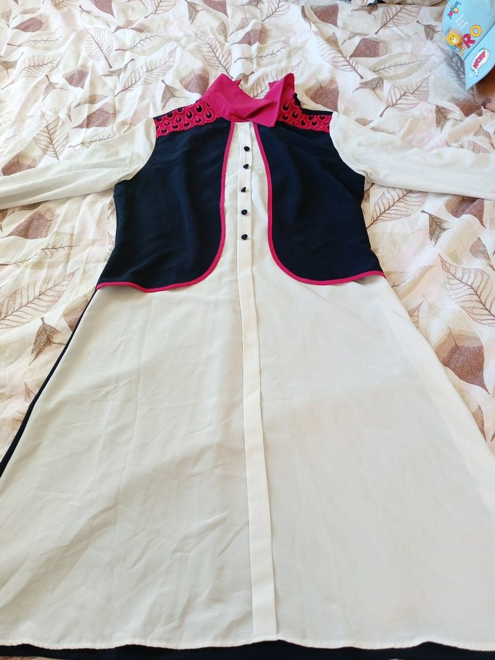 Düğmeli önü, yakalı ve kolsuz tasarıma sahip uzun, vücuda oturan beyaz hamile tuniği, koyu renk detaylarla şık ve modern görünüm sunar.