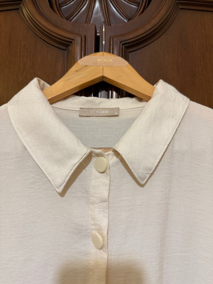 Beyaz uzun elbise, düğmeli ve yakalıdır. Uzun kollu, regular fit ve desensiz sade tasarıma sahiptir.