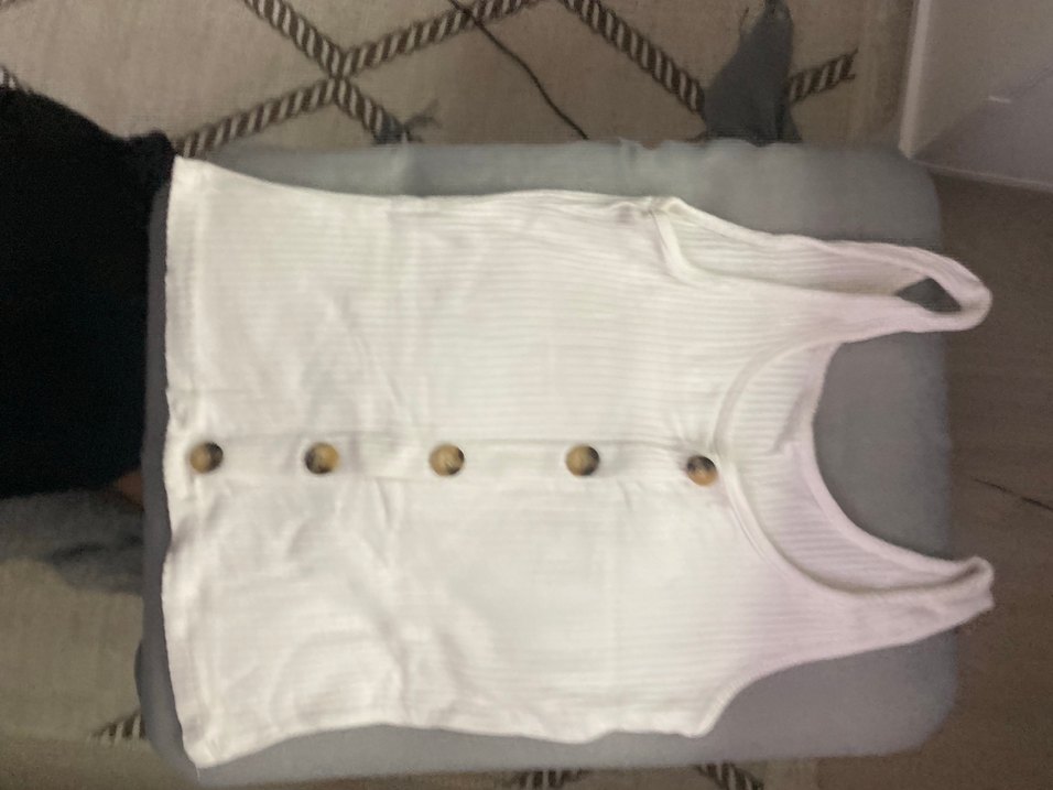 Düğmeli, V yakalı, beyaz, fit kesim, kolsuz emzirme atleti. Yumuşak ve ince dokulu kumaş kullanılmıştır.