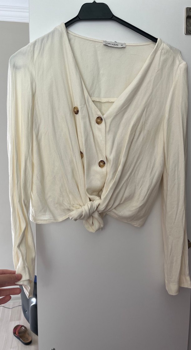 Düğmeli, V yakalı beyaz kadın gömleği, uzun kollu ve önünde düğme detaylarıyla düğüm bağlamalıdır. Hafif ketenden yapılmış, bol kesim, bohem ve minimalist bir tarz sunar. Günlük kullanım için uygundur.