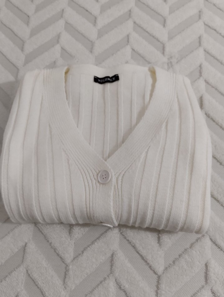 Beyaz renkli, düğmeli, V yakalı, uzun kollu, normal midi boyda, fit kesim kadın hırka. Rahat ve sade tasarıma sahiptir.