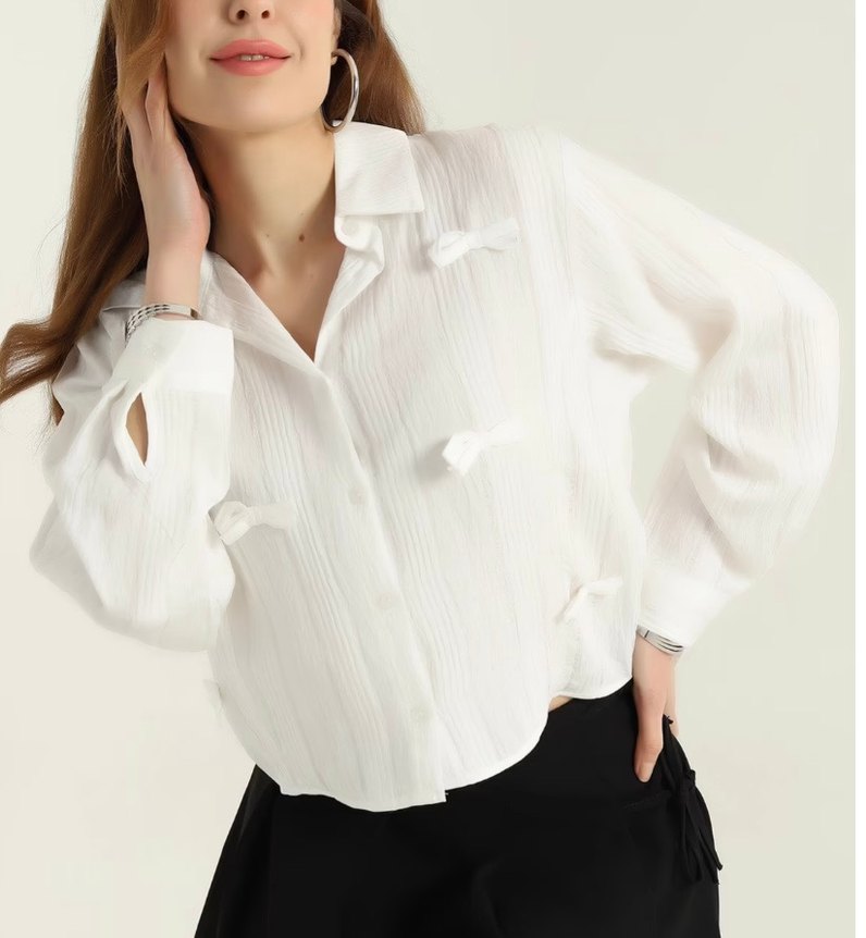 Beyaz keten kumaştan, düğmeli, uzun kollu ve V yaka, normal boyda, bol kesim kadın gömlek. Ofis ve sokak stiline uygun.