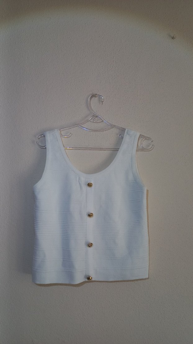 Pamuk kumaştan, düğmeli ve V yakalı beyaz, kısa ve vücuda oturan kollu . Minimalist ve şık sokak stili için uygundur. (defosu yoktur.)