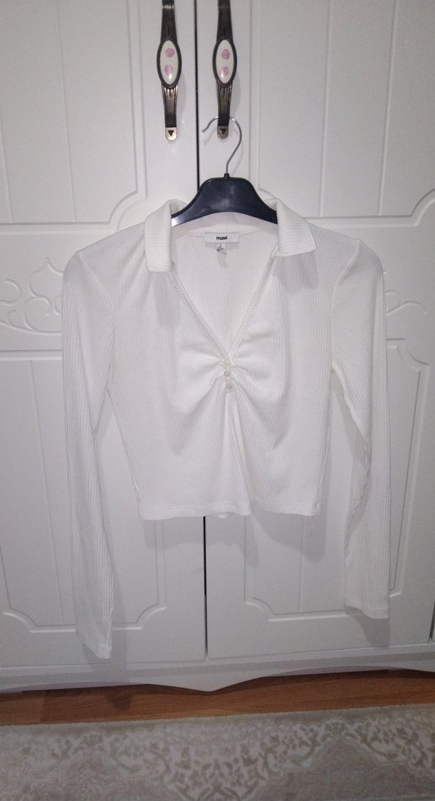 Beyaz, uzun kollu, düğmeli ve V yaka kesime sahip, kısa boylu, ince kesim kadın bluz. Yumuşak keten kumaştan, günlük ve şık sokak tarzı için uygun.
