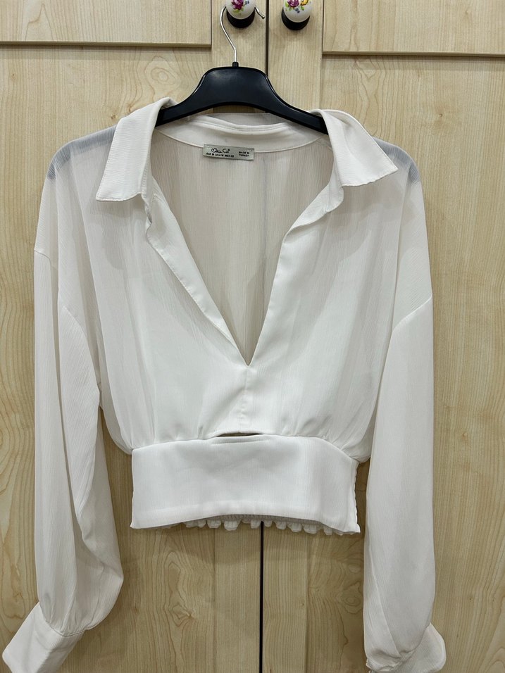 Pamuklu beyaz kadın gömleği, V-yaka ve düğmeli öne sahip. Uzun kollu, kısa boylu ve regular fit kesim. Ofis için uygun minimalist tarzda.