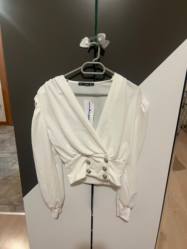 Pamuklu, V yakalı ve uzun kollu beyaz bluz, düğmeli bel detayıyla rahat ve salaş bir görünüm sunar. Günlük sokak stiline uygun.