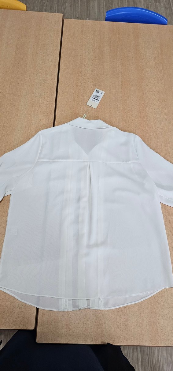 Düğmeli, V yakalı beyaz kadın gömleği, kısa kollu ve regular fit. Sentetik kumaştan, midi boyda, ofis için uygun.