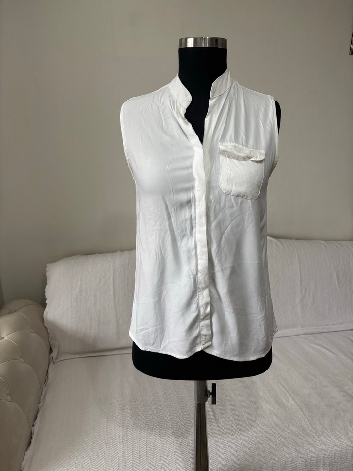 Pamuk kumaştan, kolsuz ve düğmeli ön kısmı ile beyaz gömlek. V yakalı, normal kesim ve göğüs cebine sahip, günlük sokak tarzına uygun.