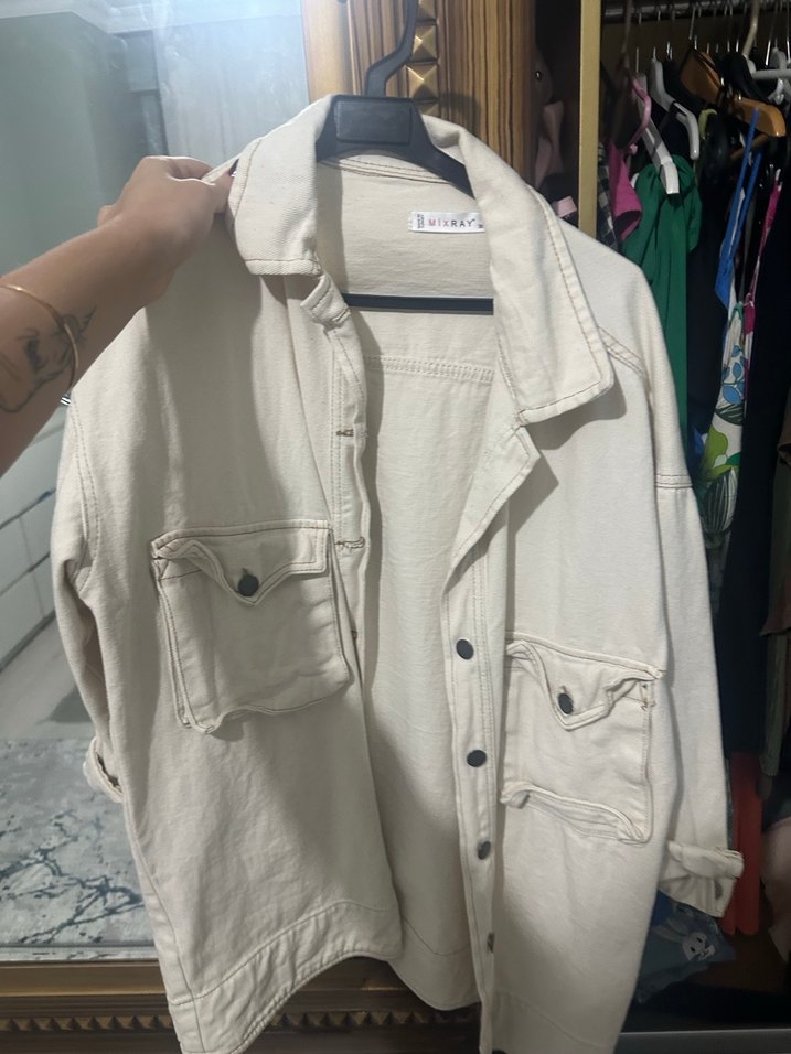 Düğmeli, beyaz pamuklu midi ceket. Geniş kesim, uzun kollu ve çıtçıtlı iki cep detayına sahip. Günlük kullanıma uygun.