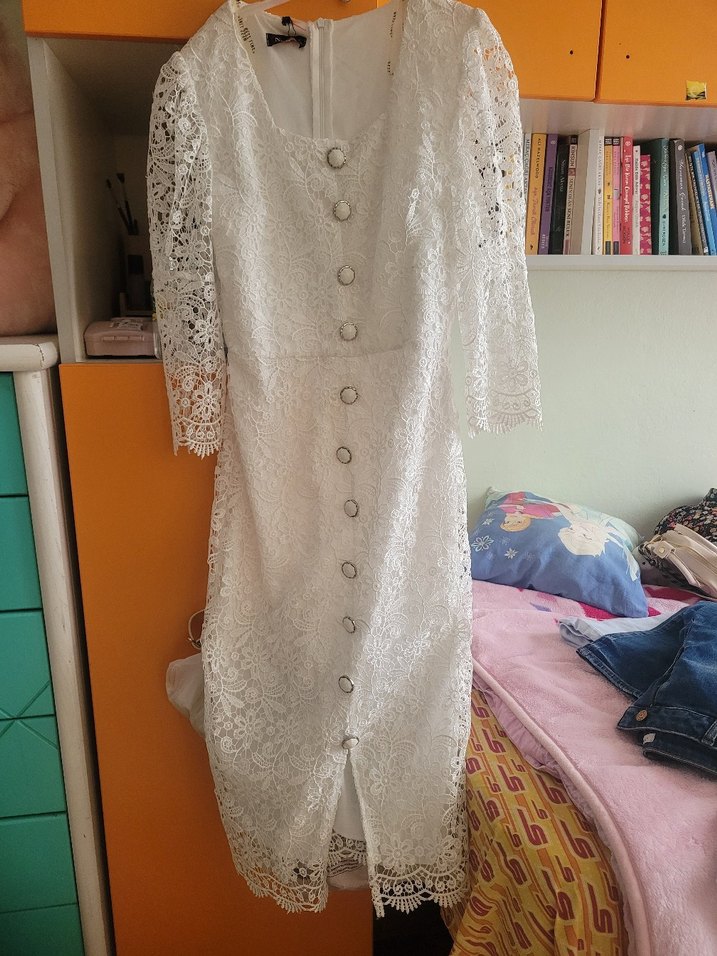 Düğmeli Beyaz Vintage Dantel Uzun Abiye Elbise