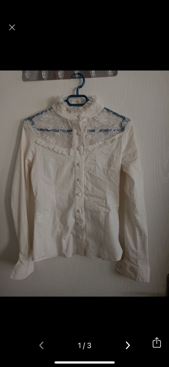 Düğmeli, yakalı ve uzun kollu, vintage goth tarzında, pamuklu ve fitted kesim beyaz gömlek, dantel detaylı.