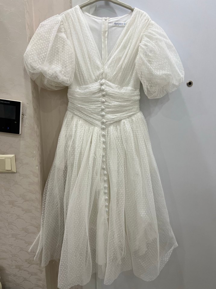 V yaka, kısa kabarık kollu düğmeli beyaz vintage uzun elbise. Pamuk kumaş, hafif puantiye deseni ve bol kesim. Bohem düğün tarzı için uygun.