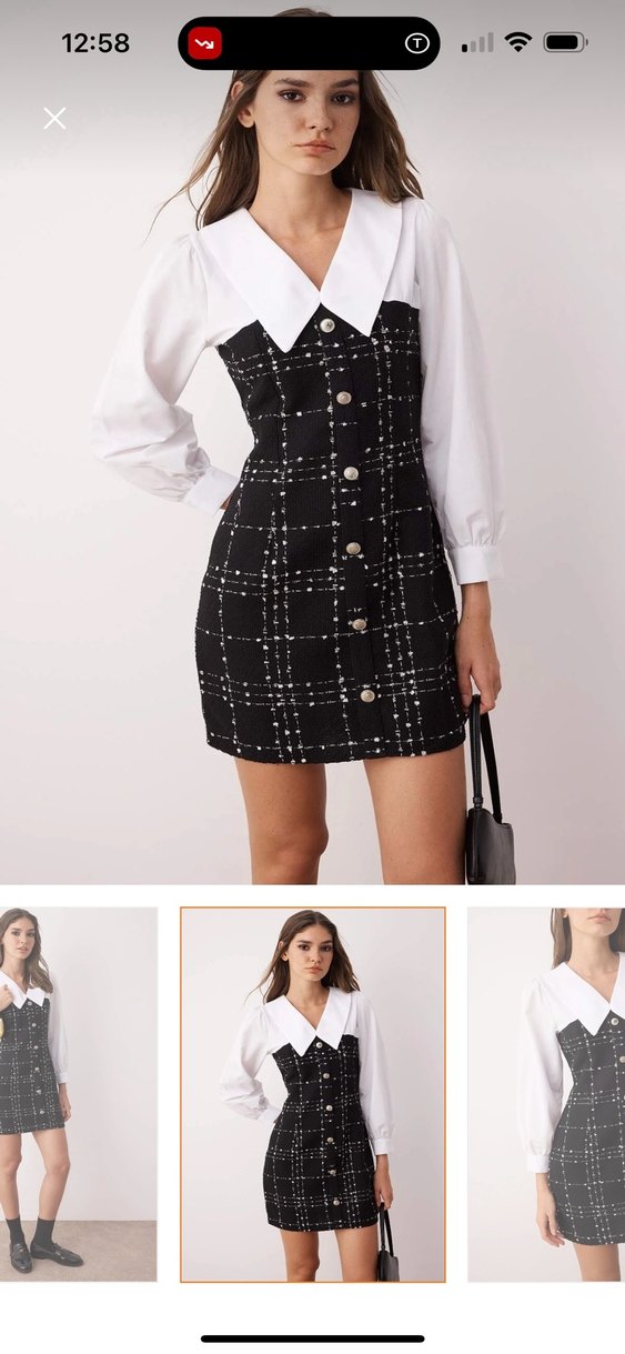 Uzun kollu, beyaz yakalı ve düğmeli midi kadın elbisesi. Sentetik kumaş, koyu renkli kareli deseniyle ofis için uygun rahat kesim.