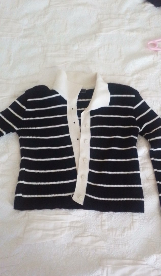 Düğmeli, yakalı, uzun kollu ve fitted kesime sahip triko kazak. Koyu renk beyaz çizgili deseniyle günlük sokak stiline uygun.