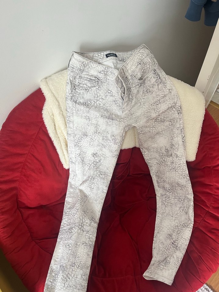 Pamuklu, düğmeli, gri yılan desenli beyaz, normal boy, dar kesim kadın pantolonu. Sokak modasına uygun, günlük kullanıma uygun.