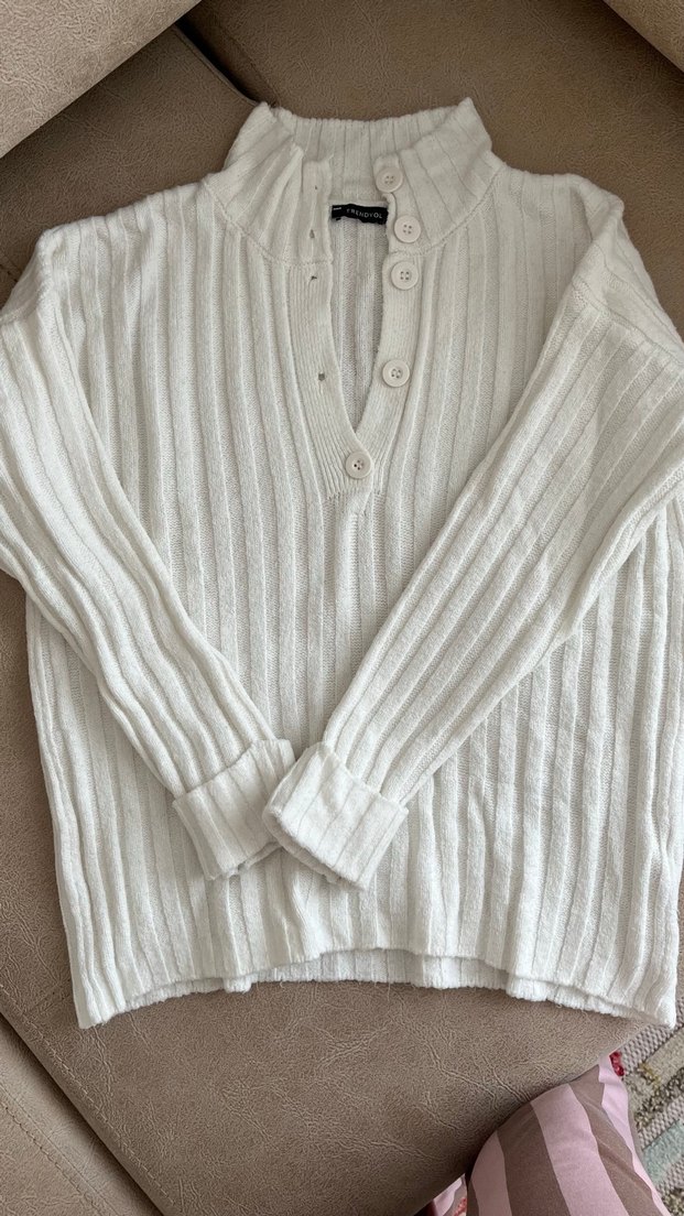 Düğmeli önü ve yüksek yakası olan beyaz triko kazak, uzun kollu ve rahat kesimdir. Fitilli dokusu ve midi boyu ile günlük kullanıma uygundur.