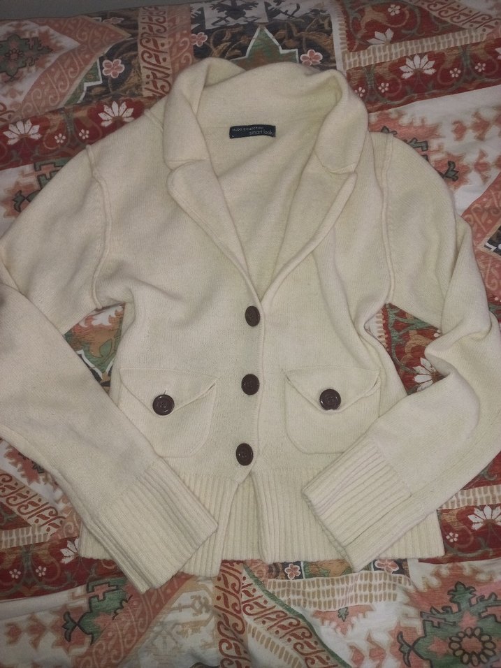 Düğmeli ve beyaz yünlü hırka. Uzun kollu ve rahat L-M