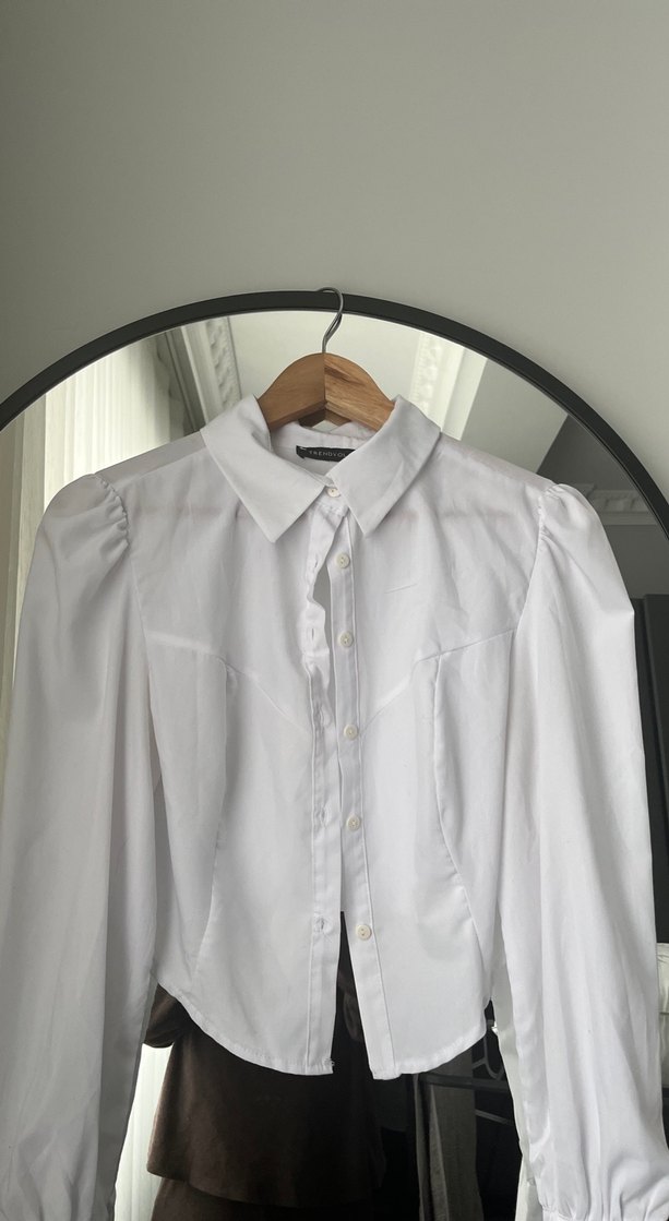 Düğmeli, uzun kollu, yakalı beyaz keten gömlek. İnce kesimiyle modern iş ortamları için uygun.