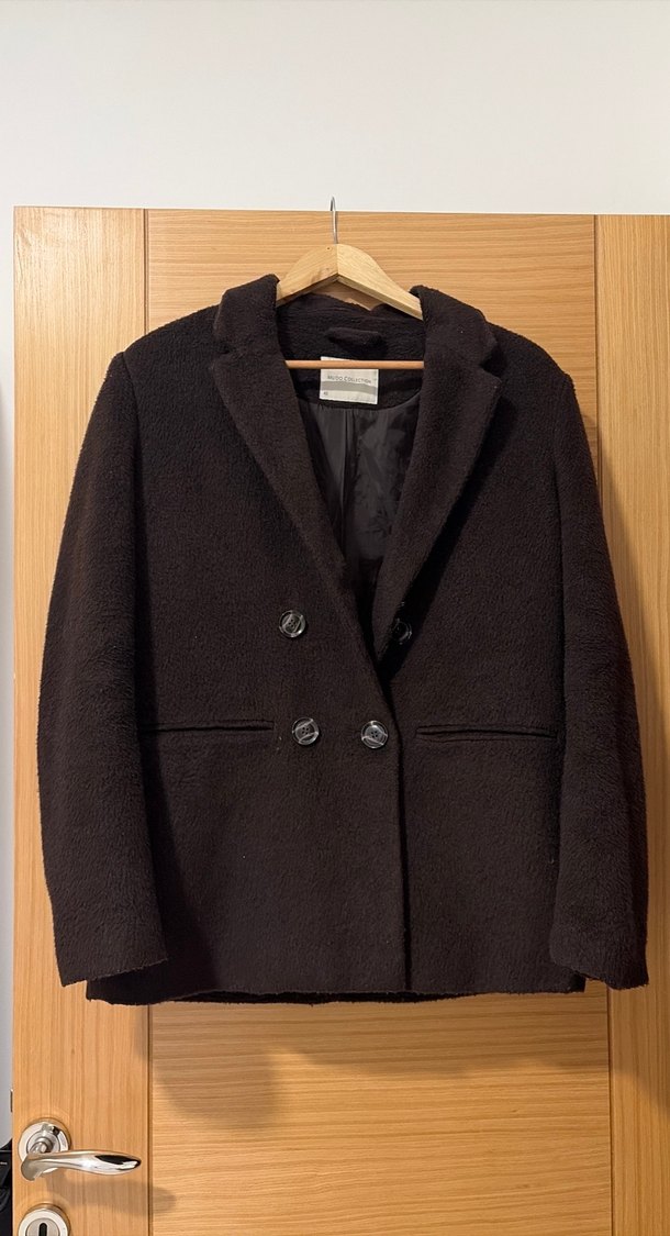 Düğmeli, notalı yaka kahverengi kadın kaban. Uzun kollu, normal kesim ve midi boyda, yumuşak ve sıcak kumaştan üretilmiştir.
