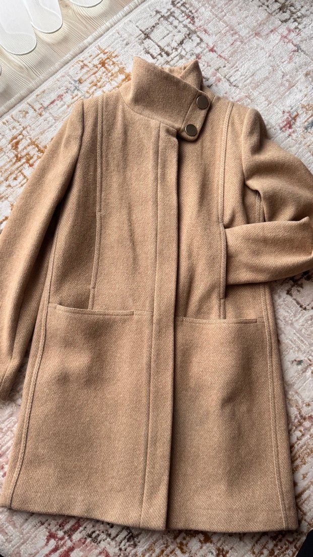 Düğmeli boğazlı ve geniş ön cepleri olan camel renkli, yumuşak ve sıcak kumaştan kaban.