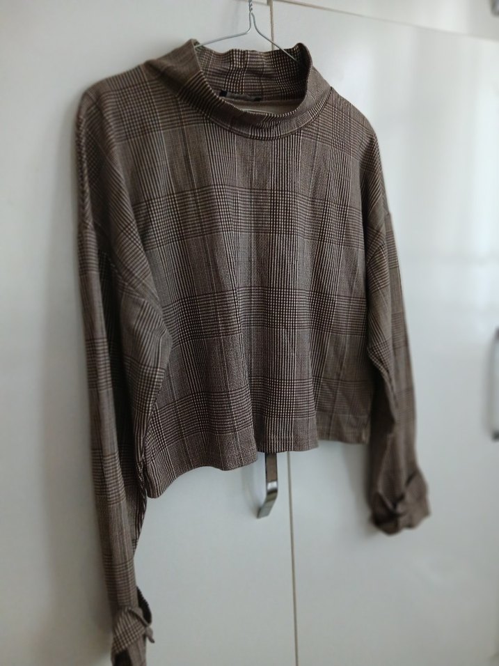 Düğmeli, boğazlı ve uzun kollu, yumuşak keten kumaştan rahat kesim kadın triko. Gri-kahverengi kareli desene sahip, günlük sokak stiline uygun.