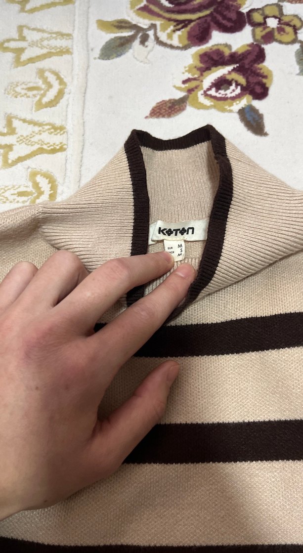 Düğmeli boğazlı kahverengi triko kazak, uzun kollu ve normal midi boydadır. Rahat ve şık sokak stili için uygundur.