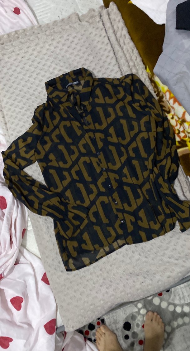 Düğmeli, boğazlı, uzun kollu, kahverengi desenli kadın gömleği. Sentetik kumaştan, salaş kesim ve günlük kullanıma uygun.