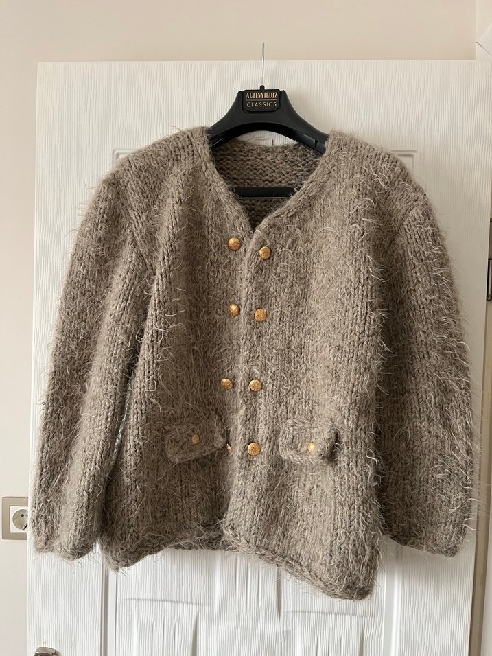 Bej renkli, düğmeli, uzun kollu, gevşek kesim, bohem tarzda örme kadın hırkası. Rahat dokusu ve normal boyu ile günlük kullanıma uygundur. Markası Zara değildir marka temsili yazılmıştır