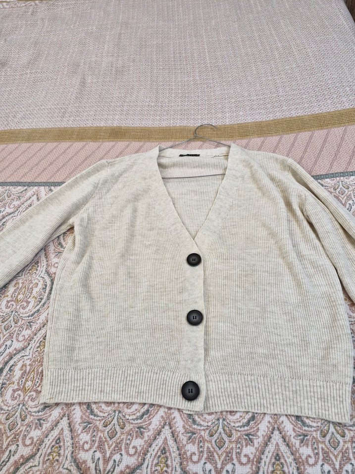 Uzun kollu, V yaka, düğmeli bej triko hırka. Bol kesimi ve midi boyuyla günlük kullanıma uygun bohem tarz sunar.