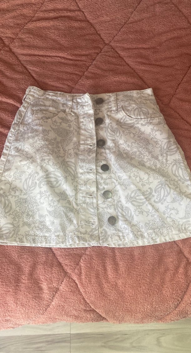 Düğmeli ön kısmı ve bol kesimi ile beyaz midi etek, gri tie-dye desenlere sahip. Sentetik kumaştan, bohem ve vintage tarzını yansıtıyor.