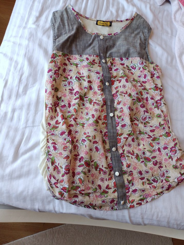 Düğmeli, kolsuz bluzu, rahat kesimli ve yumuşak ketenden üretilmiştir. Gri üst kısmı ve çiçek desenli alt kısmı ile günlük kullanıma uygun bohem vintage tarzını yansıtır.