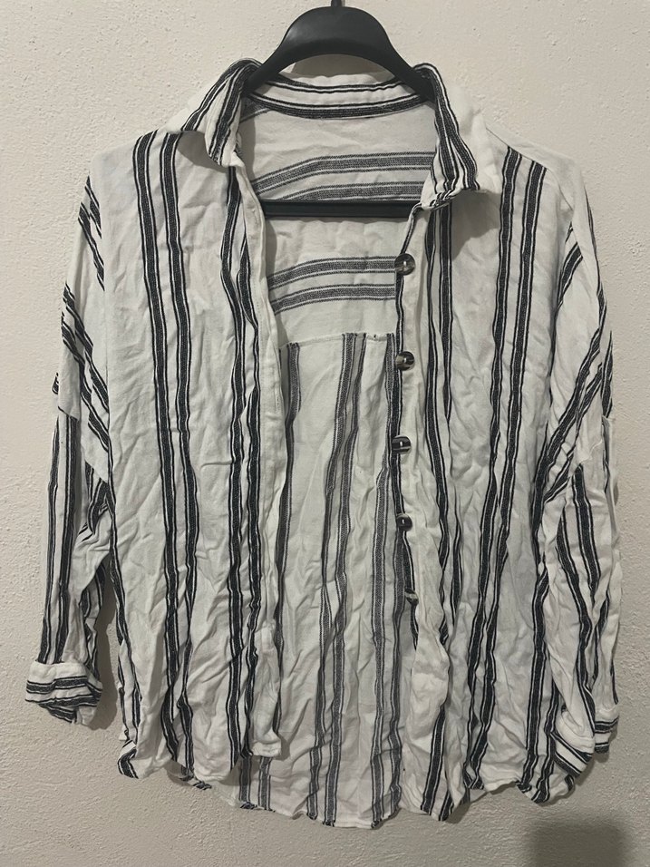 Gri beyaz çizgili, düğmeli ve yakalı keten gömlek. Uzun kollu, bol kesim ve günlük kullanıma uygun. Az kullanılmış