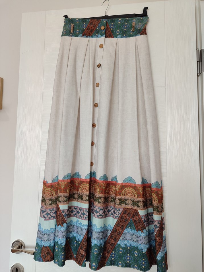 Düğmeli, bol kesim, çok renkli batik desenli uzun etek. Yumuşak dokulu tekstil kumaştan yapılmıştır, günlük kullanıma uygundur. marka temsildir.