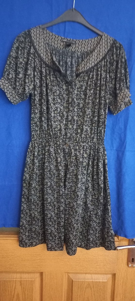 Düğmeli, kısa kollu, V yakalı elbise. Bohem desenli, gri renkte, midi boy ve bol kesimdir. Yumuşak sentetik kumaştan üretilmiştir.