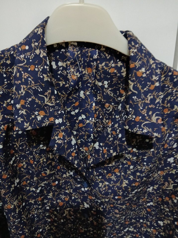 Lacivert renkte, düğmeli ve yakalı, kısa kollu, bohem desenli kadın gömleği. Normal boy ve rahat kesim ile günlük kullanıma uygun.