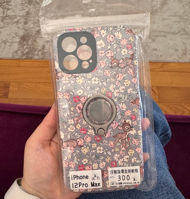 Düğmeli halka tutuculu, bohem tarzda gri iPhone 12 Pro Max kılıfı. Çiçek desenli ve güvenli tutuş sağlar.