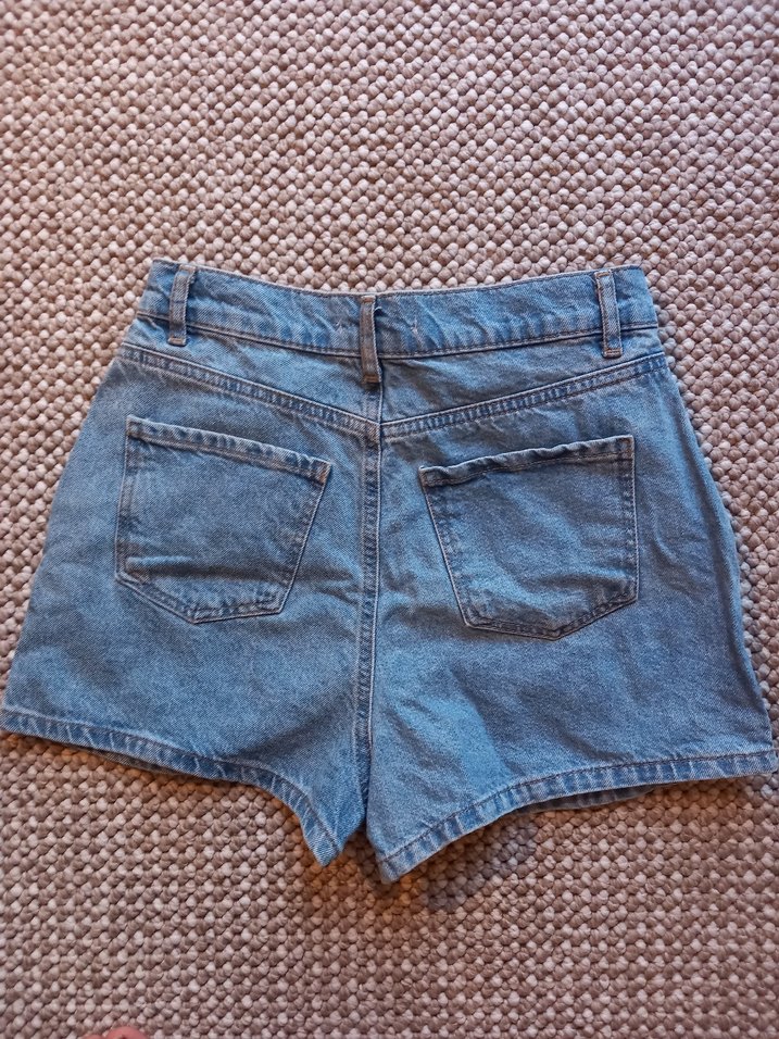 Düğmeli, cep detaylı, bol kesim gri mini denim şort, rahat ve desensiz, günlük sokak giyimine uygun.