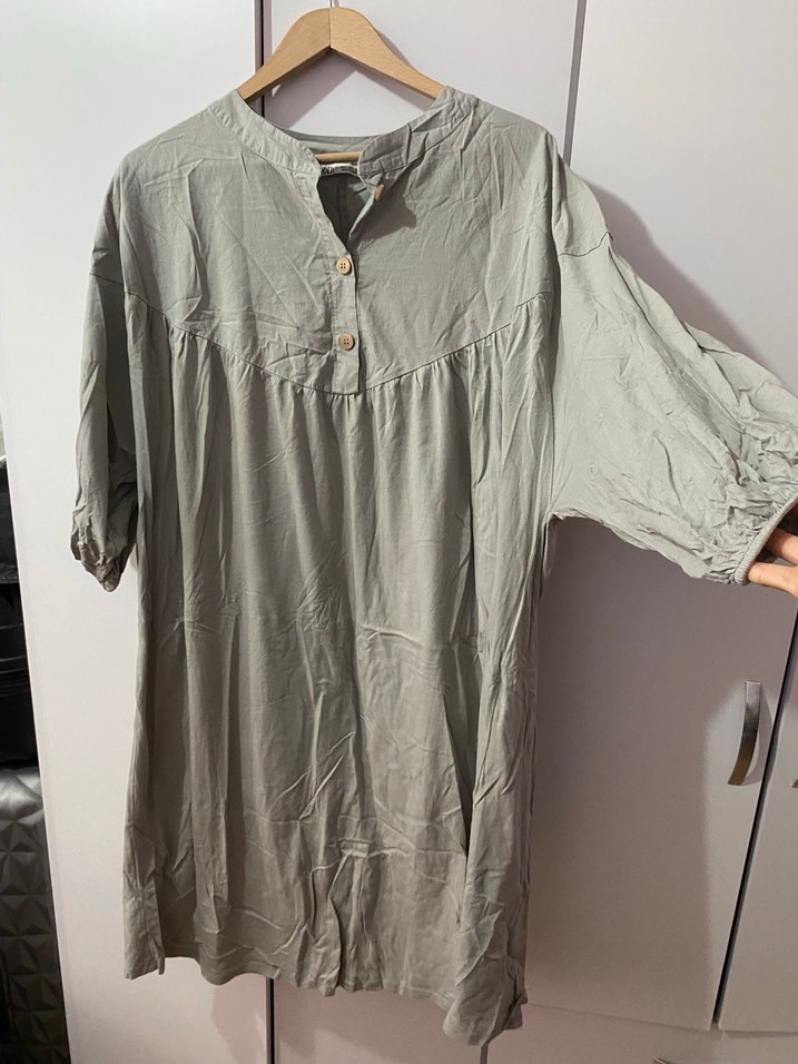 Bej renkte, keten kumaştan, V yaka ve düğmeli önü olan bol kesim midi tunik. Kısa kollu ve bohem tarzda. Bir kere yikandi sadece giyilmeden.
