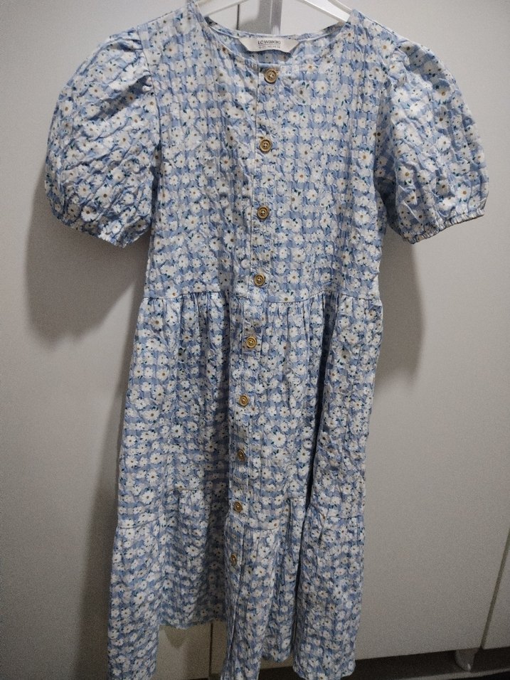 Pamuk kumaştan üretilmiş, düğmeli, kısa balon kollu, bohem tarzda, mavi çiçek desenli bol kesim kız elbisesi. 1,defa kullanıldı