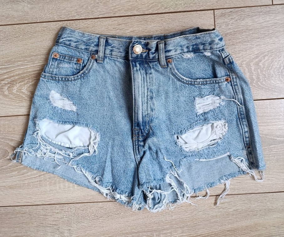 Düğmeli, yırtık detaylı, bol kesim gri-mavi mini denim şort. Günlük kullanım için rahat ve sokak stiline uygun.