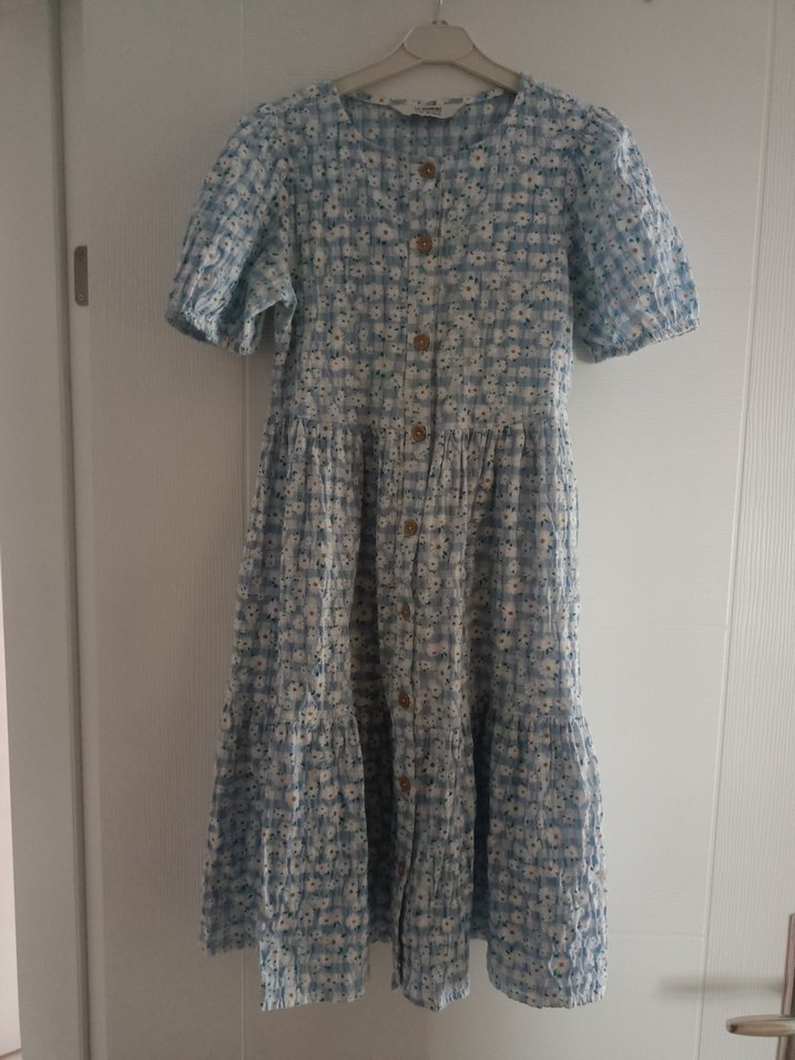 Bol kesim, uzun keten elbise, kısa kollu ve yuvarlak yakalıdır. Önü düğmeli, mavi-gri tonlarda bohem tie-dye desenlidir.