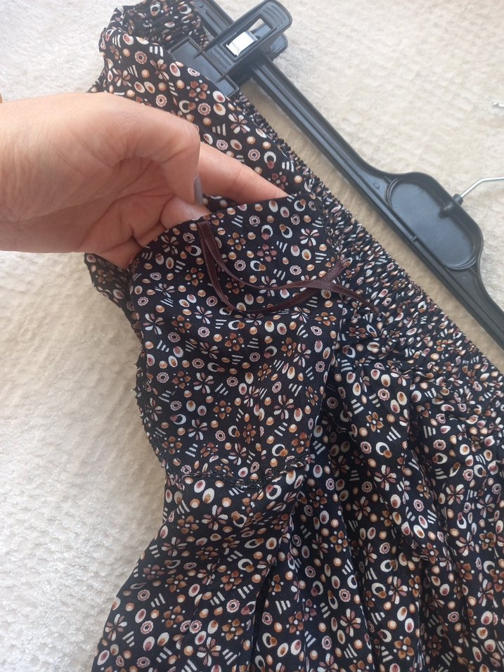 Yumuşak sentetik kumaştan, düğmeli detaylı, bol kesim midi hamile eteği. Koyu kahverengi bohem desenli, günlük kullanıma uygun.