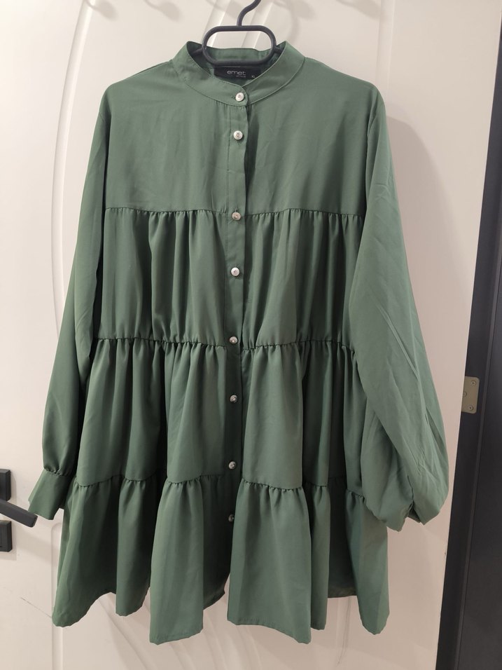 Yüksek yakalı, uzun kollu ve bol kesimli khaki renkli kadın tunik. Düğmeli ön kısmı, midi boyu ve katlı tasarımı vardır. Yumuşak keten kumaştan, desensiz bohem tarzda.