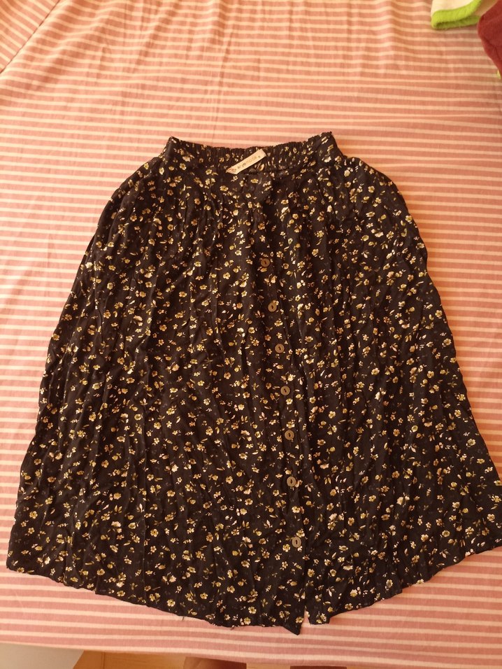 Düğmeli, bol kesim midi hamile eteği, koyu kahverengi ve bohem tarzda. Yumuşak sentetik kumaştan üretilmiştir. Ürünün arka kısmı da defo vardır ancak alt etek kısmında olduğu için belli olmuyor giyildiğinde