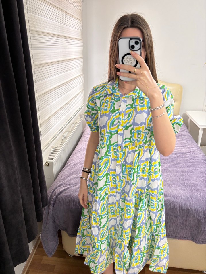 Düğmeli, yakalı kısa kollu, bol kesim mini elbise. Pastel çok renkli tie-dye desenli, yumuşak sentetik kumaştan yapılmıştır.